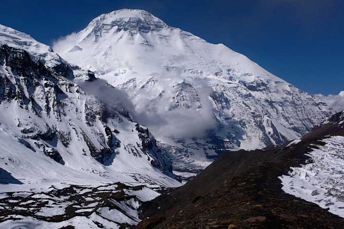 The trek often starts from Beni, and the trail leads through the villages of Darbang and Muri before reaching the Dhaulagiri region.